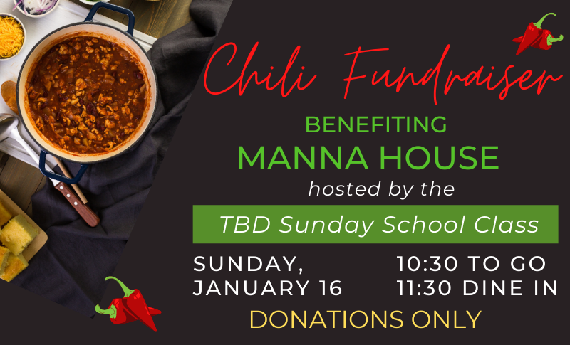 Each year the TBD Sunday School Class hosts their Chili Fundraiser to benefit Manna House. Join them after church in the Family Life Center for a bowl of delicious chili. If you'd rather not stay to eat, you're welcome to get your chili to go. Just hop over, make a donation of any amount you wish, and they'll pack up some chili to send you home with!