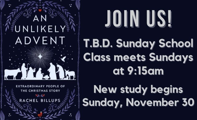 TBD Sunday School Class invites you to join them this Advent season for "An Unlikely Event" by Rachel Billups. Book is not required to be purchased, but can be purchased on Amazon if you wish.